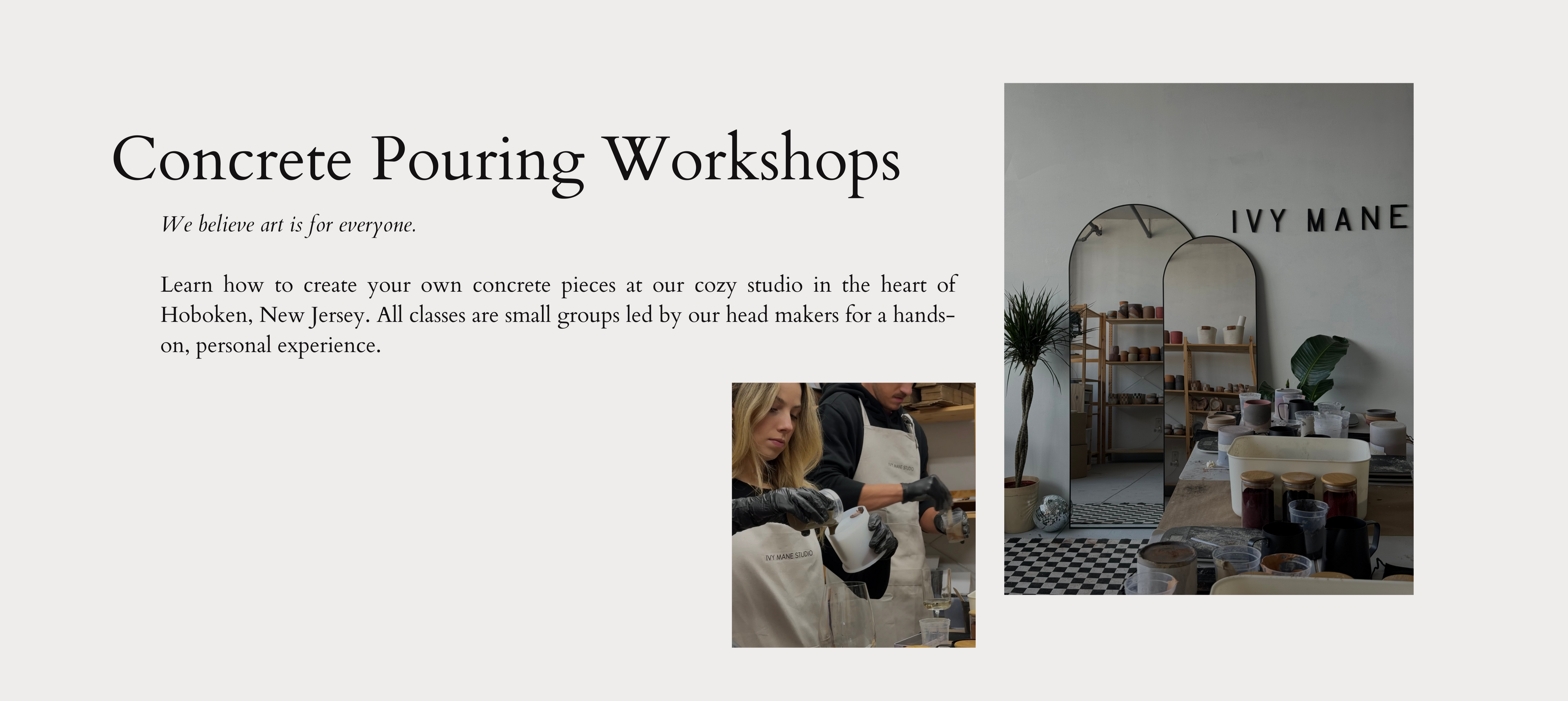 In our private studio you’ll get hands-on with concrete, learn the process, and take home a one-of-a-kind piece.