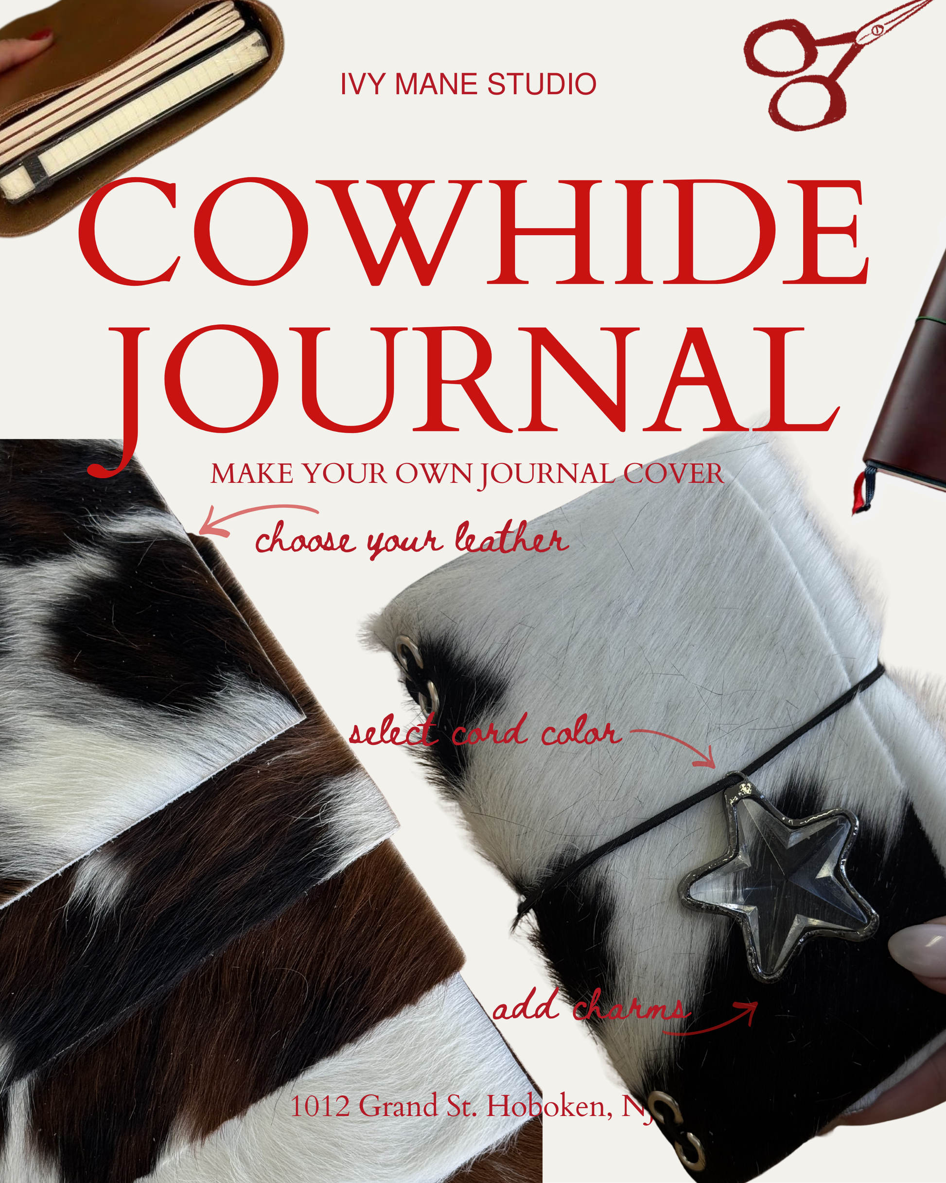 In this hands-on workshop, you’ll make your own leather journal from start to finish using authentic leather. You’ll choose your leather, cord color, and charms, then learn how to punch holes, bind the journal, and tie everything together - turning raw leather into a finished, functional journal cover.